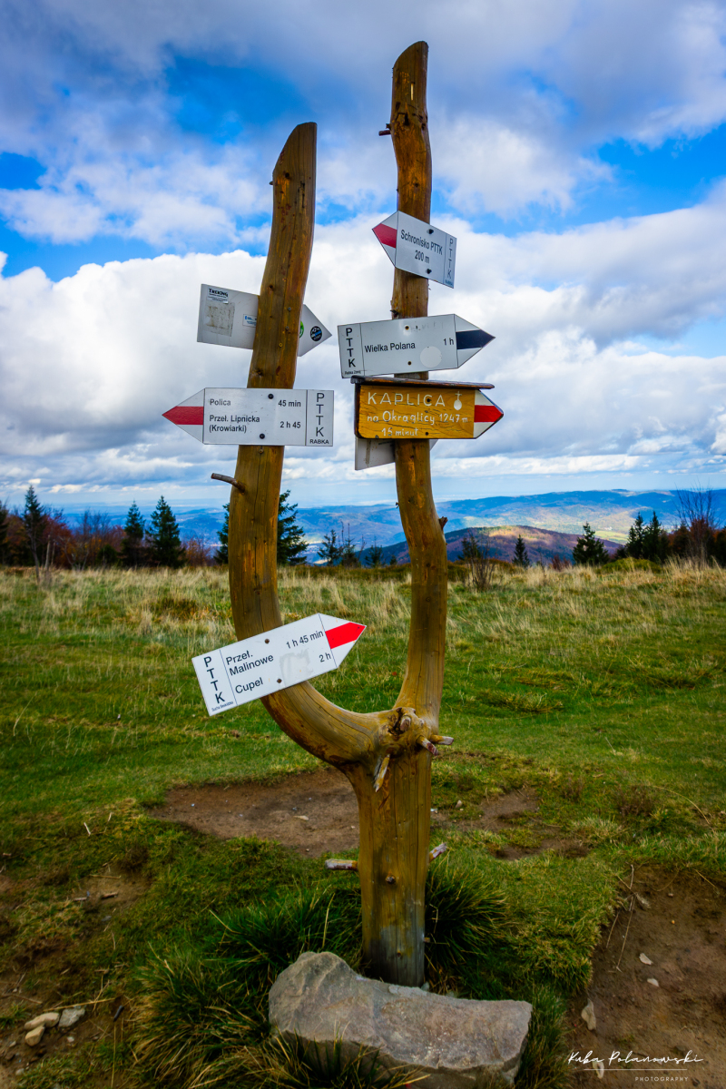 Zdjęcie przedstawiające Przełęcz Kucałową, ze słupem z tabliczkami oznaczającymi szlaki Paśmie Policy w Beskidzie Żywieckim. Przechodzi tędy Główny Szlak Beskidzki