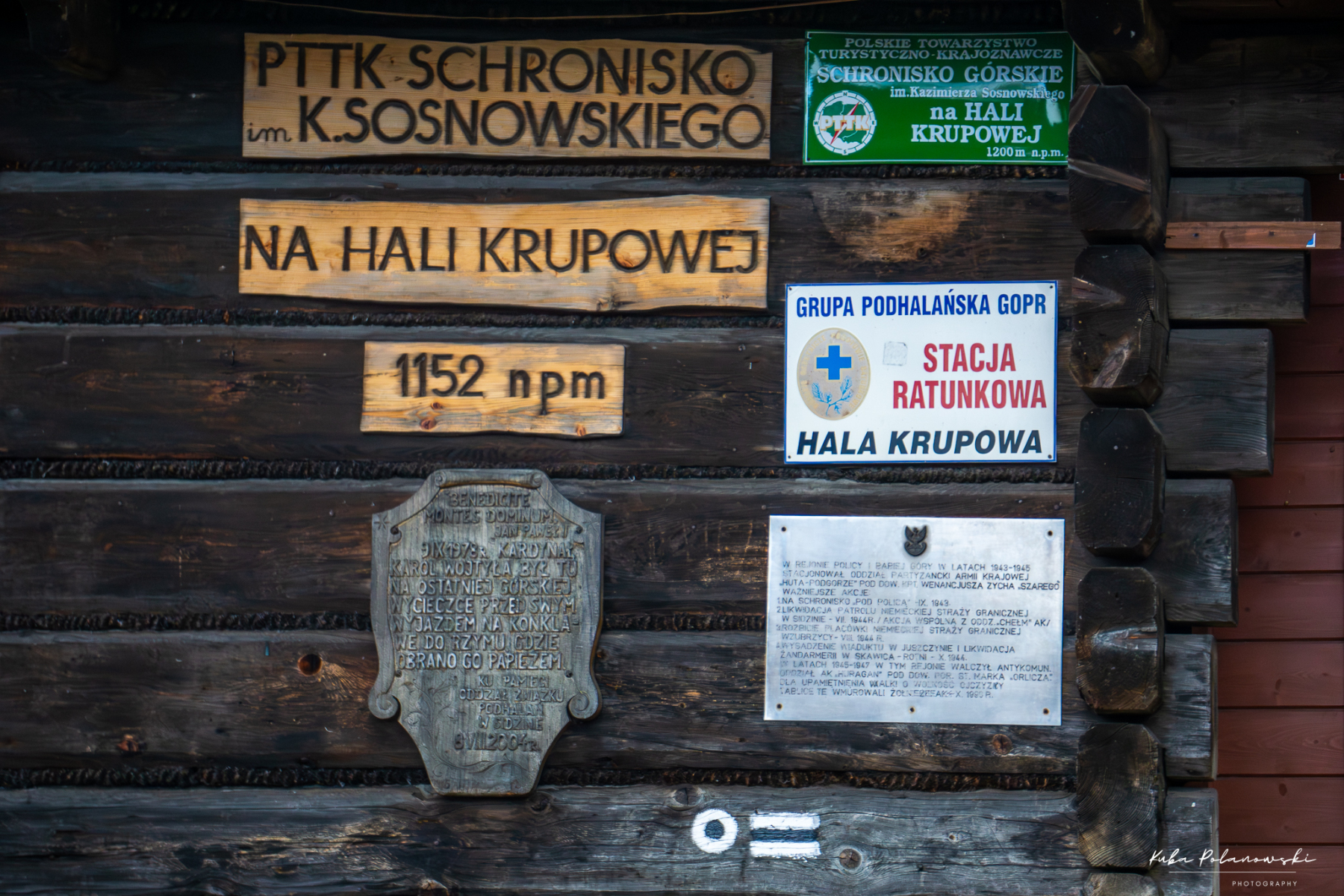 Ściana Schroniska PTTK na Hali Krupowej, stacja Górskiego Ochotniczego Pogotowia Ratunkowego, tabliczka PTTK i dwie tablice upamiętniające żołnierzy AK stacjonujących w okolicy, oraz wizytę Jana Pawła II
